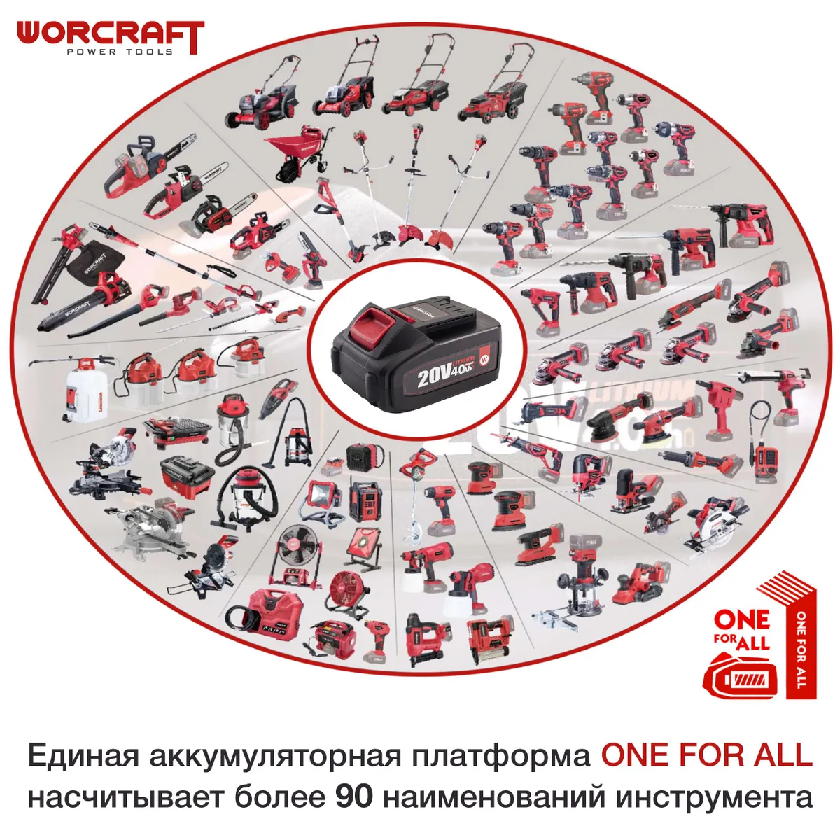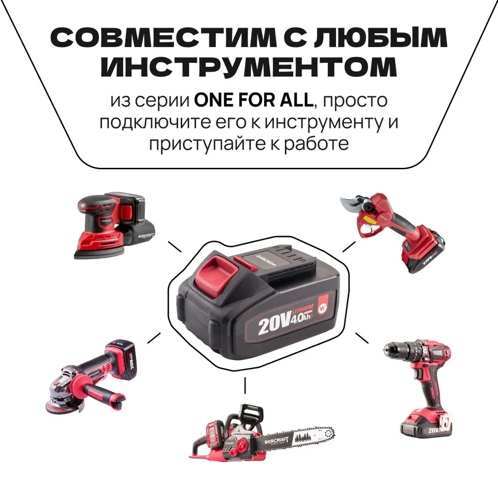 Самое классное – эта батарея подходит ко всем инструментам WORCRAFT серии ONE FOR ALL. Зачем мучиться с кучей аккумуляторов, если можно использовать один для всего? Просто вставляете его в инструмент и вперёд, к работе!