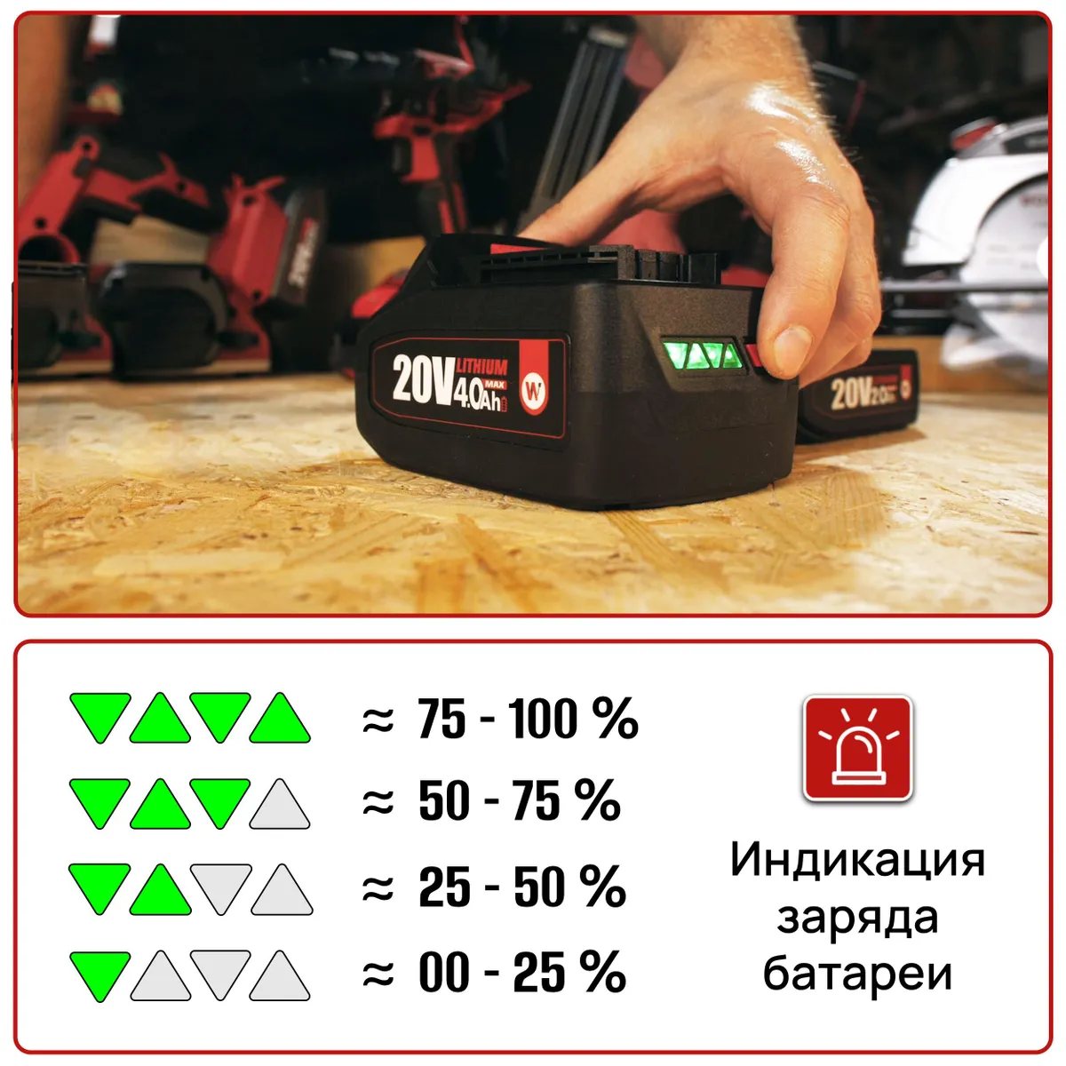 Эта штука подходит к куче инструментов WORCRAFT, больше 50 разных моделей! Удобные индикаторы покажут, сколько заряда осталось, а технология сохранения емкости гарантирует, что батарея не потеряет свою мощность со временем. Ещё есть прикольная функция Sleep Mode, чтобы аккумулятор спокойно лежал на полке, не теряя своих свойств.