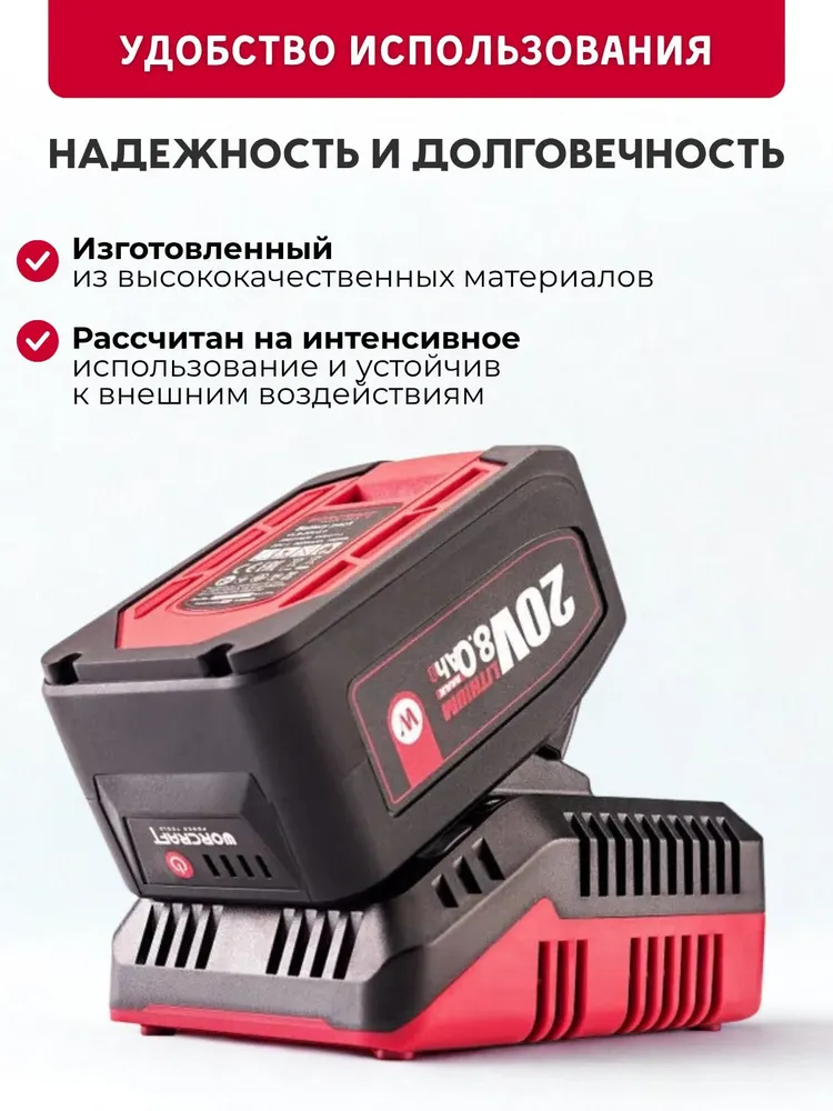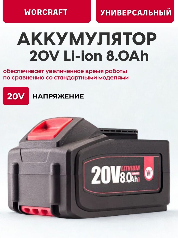 И самое главное – WORCRAFT ONE FOR ALL! Это значит, что этот аккумулятор подходит практически ко всему электроинструменту WORCRAFT. Один аккумулятор – для всех ваших инструментов. Это удобно, экономично и практично. Забудьте о куче разных аккумуляторов и зарядных устройств. Теперь у вас есть универсальное решение на все случаи жизни. Просто подключите и работайте!