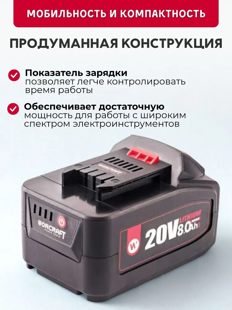 Этот аккумулятор WORCRAFT 20V Li-ion, 8.0Ah – это не просто источник питания, это настоящая находка для мастера! Забудьте о кабелях и розетках, теперь ваша свобода не ограничена длиной провода.