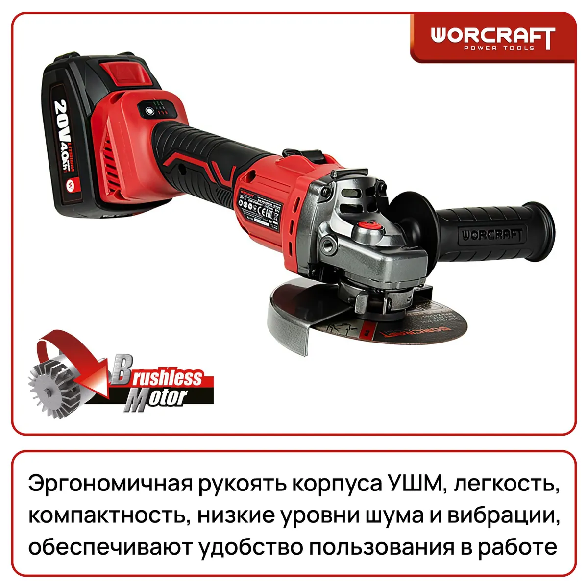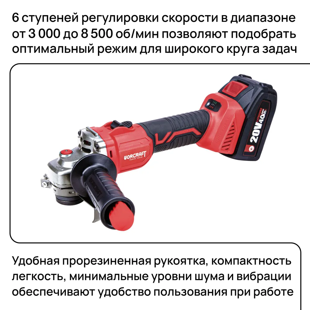 Аккумуляторная угловая шлифовальная машина WORCRAFT CAG-S20LiBH – это надежный помощник для самых разных задач. Независимо от того, нужно ли вам подготовить металл к покраске, укоротить кусок арматуры или просто отшлифовать старую деталь, этот инструмент справится на отлично.