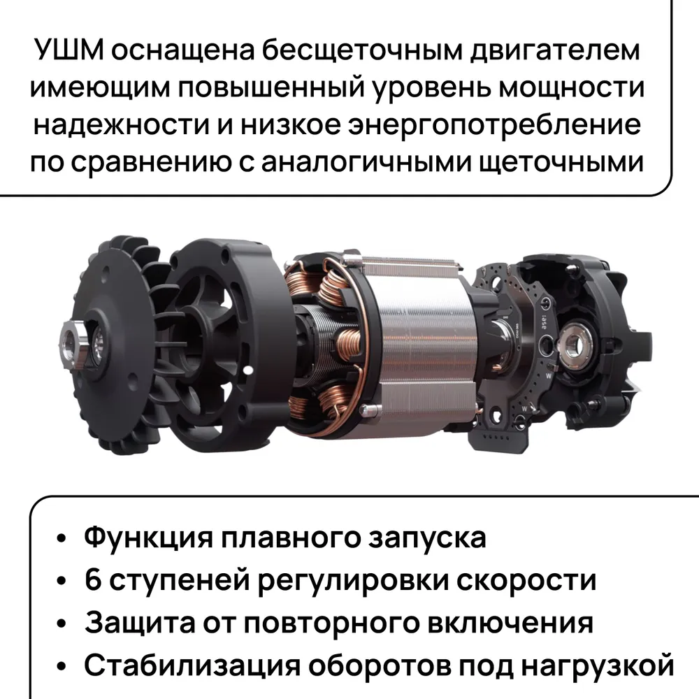 Сердцем этой угловой шлифовальной машины является мощный бесщеточный двигатель. Он не только обеспечивает высокую скорость вращения диска, но и гарантирует долгий срок службы инструмента. Бесщеточный двигатель более эффективен и надежен по сравнению с традиционными щеточными двигателями, что позволяет вам выполнять работу быстрее и с меньшими усилиями. Плюс, вы можете забыть про замену щеток, что экономит ваше время и деньги.