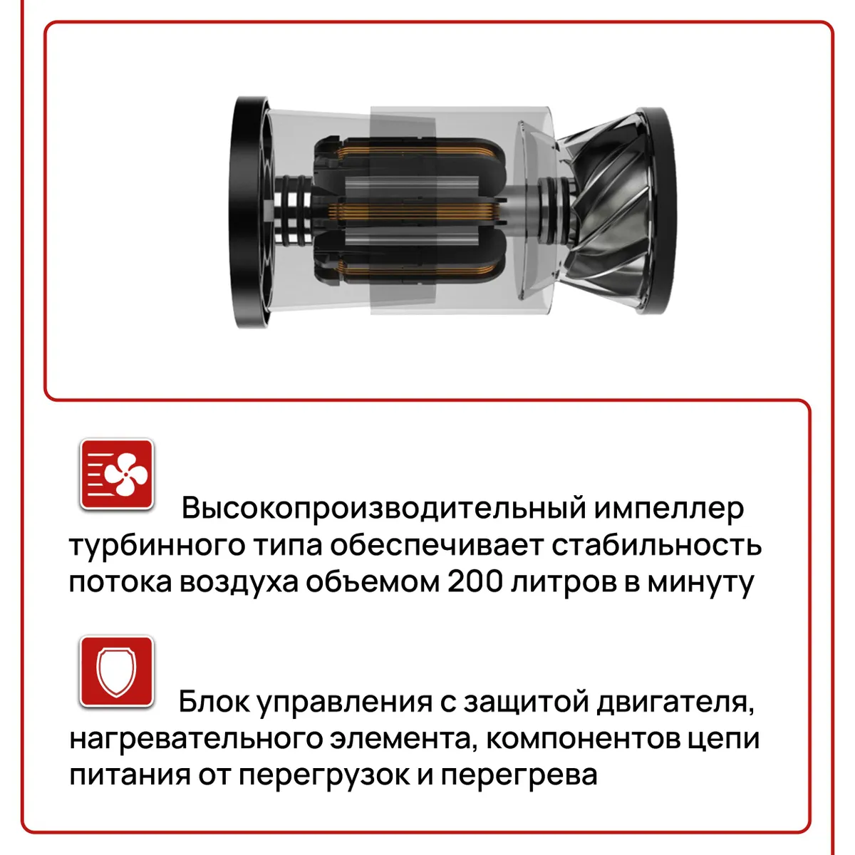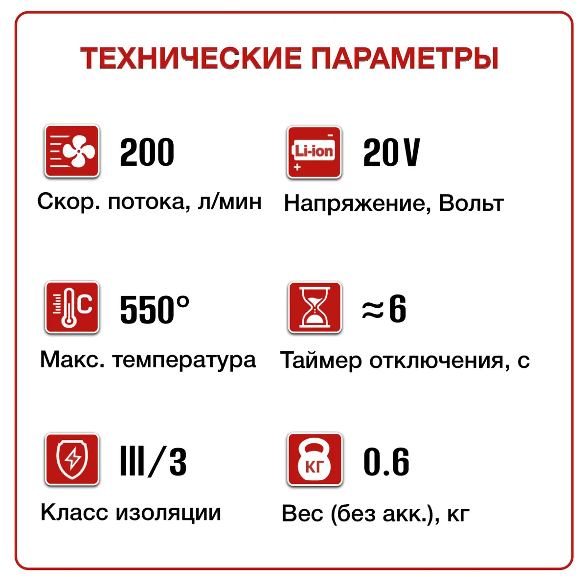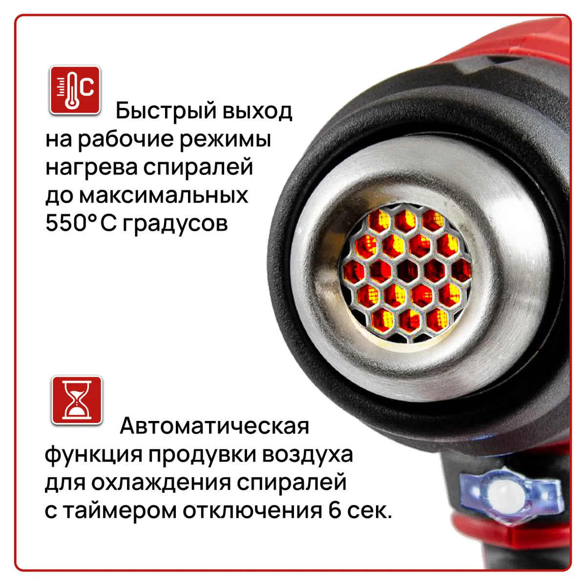 Этот фен снабжен защитой от перегрева спирали и мотора, выдает стабильную производительность в 200 л/мин, а удобная рукоятка с резиновым покрытием и яркая LED-подсветка добавляют комфорта. Быстрый нагрев до 550 °C позволяет сразу же приступить к делу.