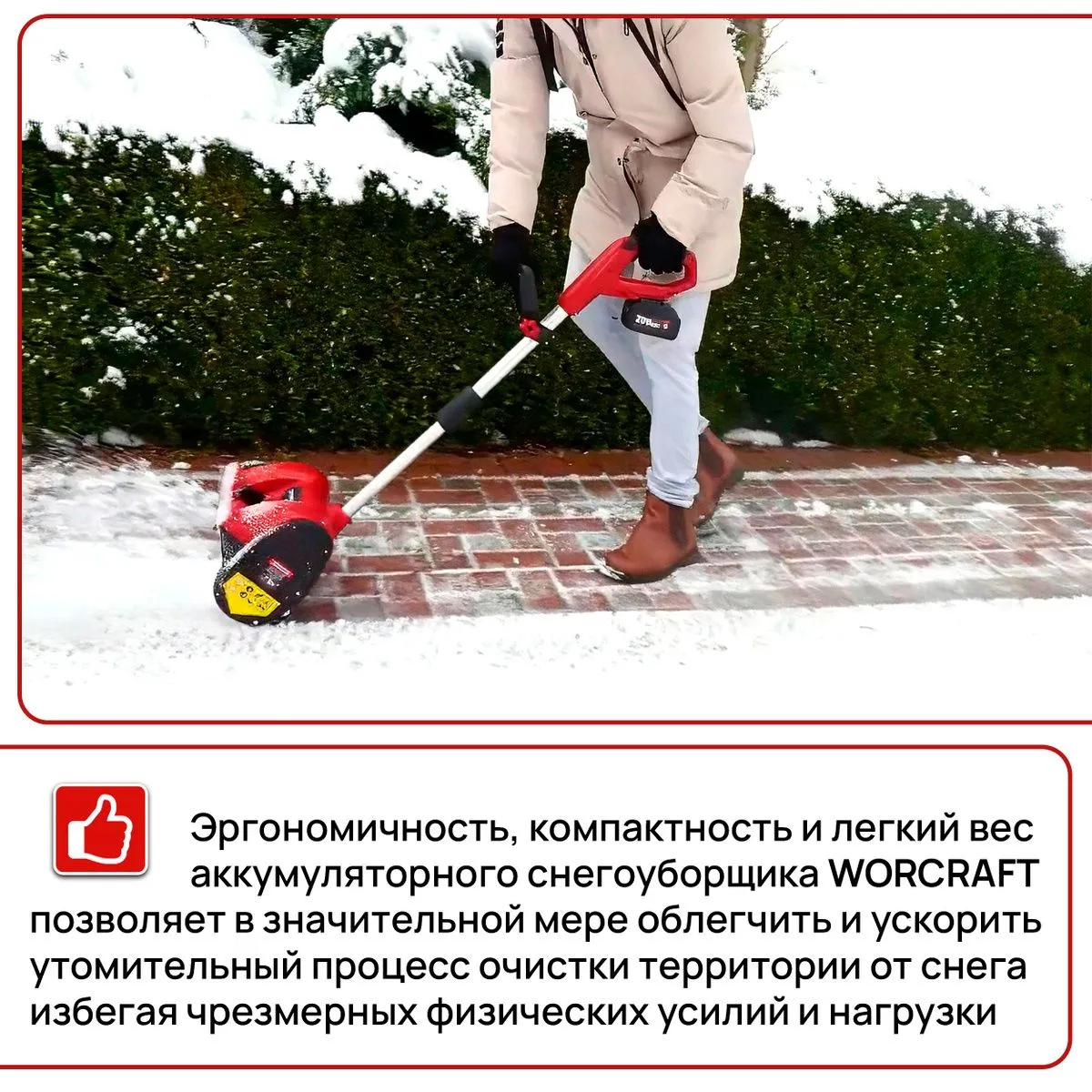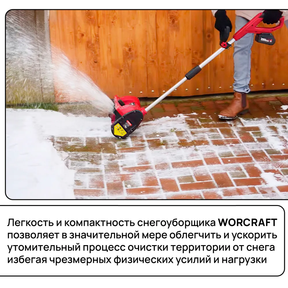 Снегоуборщик WORCRAFT CST-S20Li - это не просто инструмент, это освобождение от тяжелой ручной работы с лопатой. Представьте себе зимнее утро: вместо того, чтобы тратить часы на расчистку снега, вы просто берете легкую и удобную снегоуборочную машину, запускаете ее и за считанные минуты освобождаете дорожки от снежного плена.