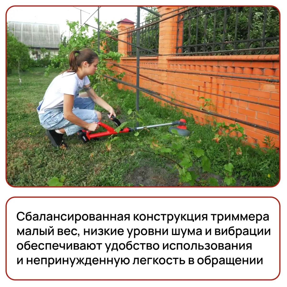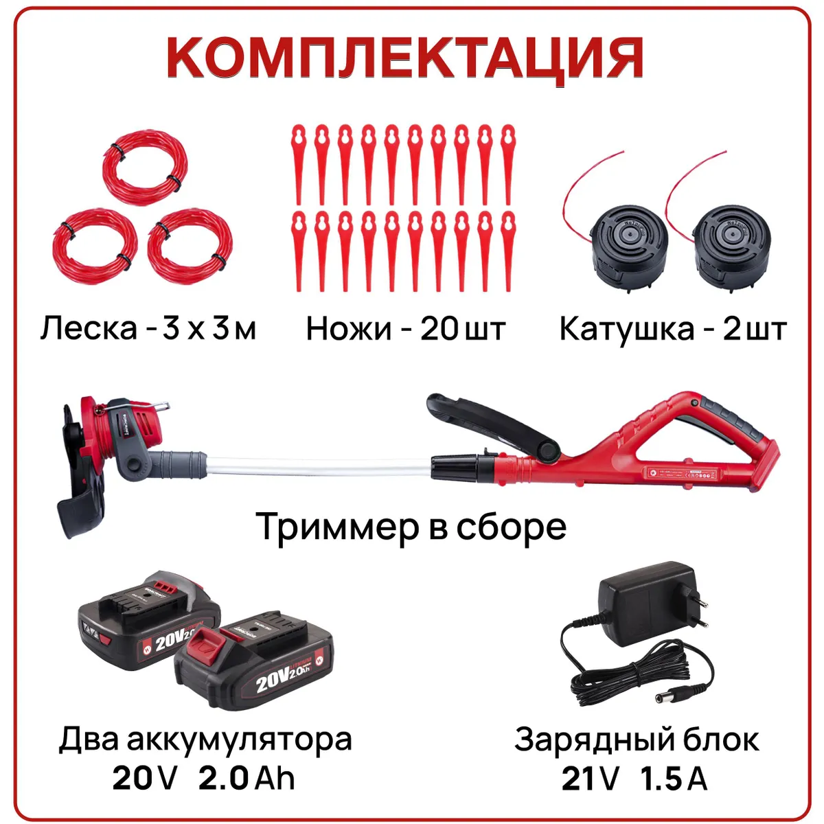 Два аккумулятора в комплекте – это настоящий подарок. Пока один аккумулятор в работе, второй заряжается. Так можно забыть о простоях и спокойно заниматься садом, не беспокоясь о том, что триммер внезапно выключится. А компактный зарядный блок 1.5А позволит быстро восстановить заряд аккумуляторов, чтобы вы могли продолжить работу.