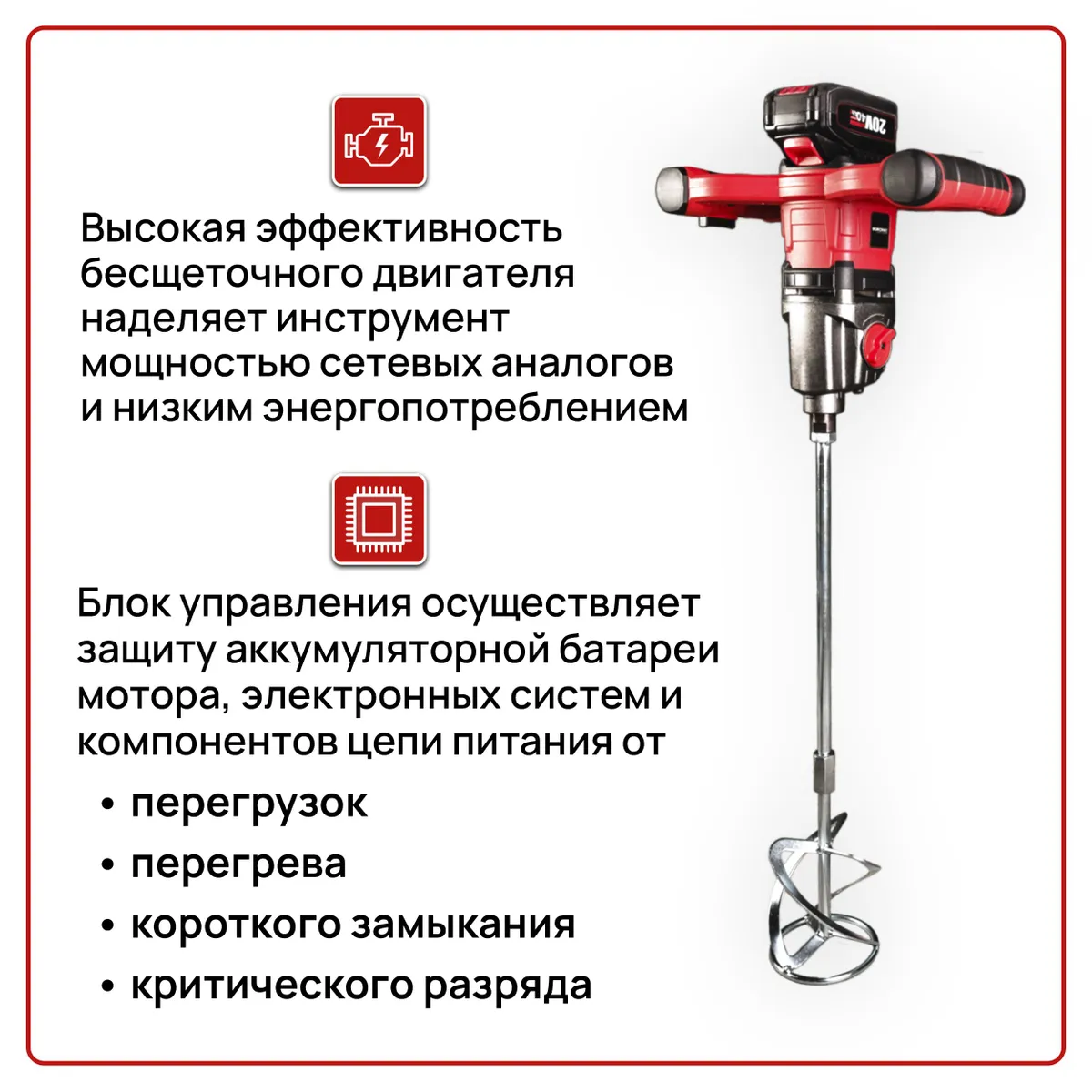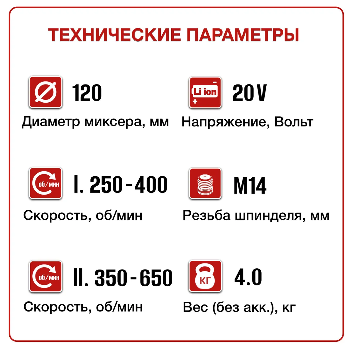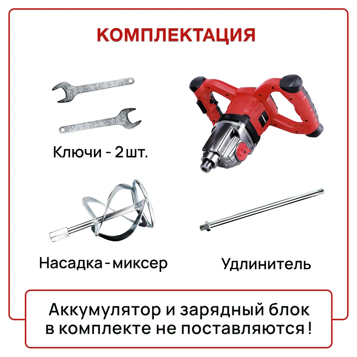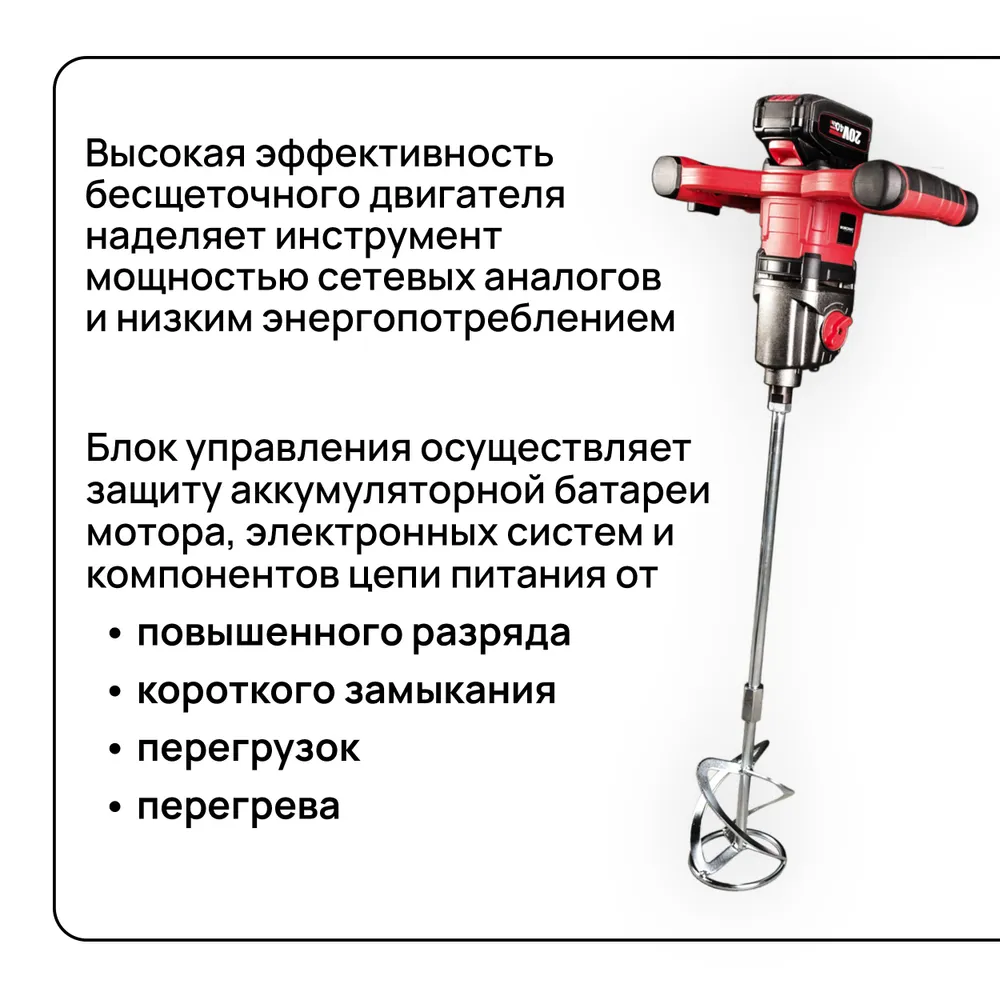 Не стоит забывать и о безопасности. Блок управления защищает инструмент от всех возможных неприятностей, таких как переразряд батареи, короткое замыкание, перегрузка и перегрев. Так что можете быть уверены, что ваш миксер прослужит вам долгие годы. А фиксатор клавиши включения снижает утомляемость при длительной работе, позволяя вам сосредоточиться на качестве замешивания.