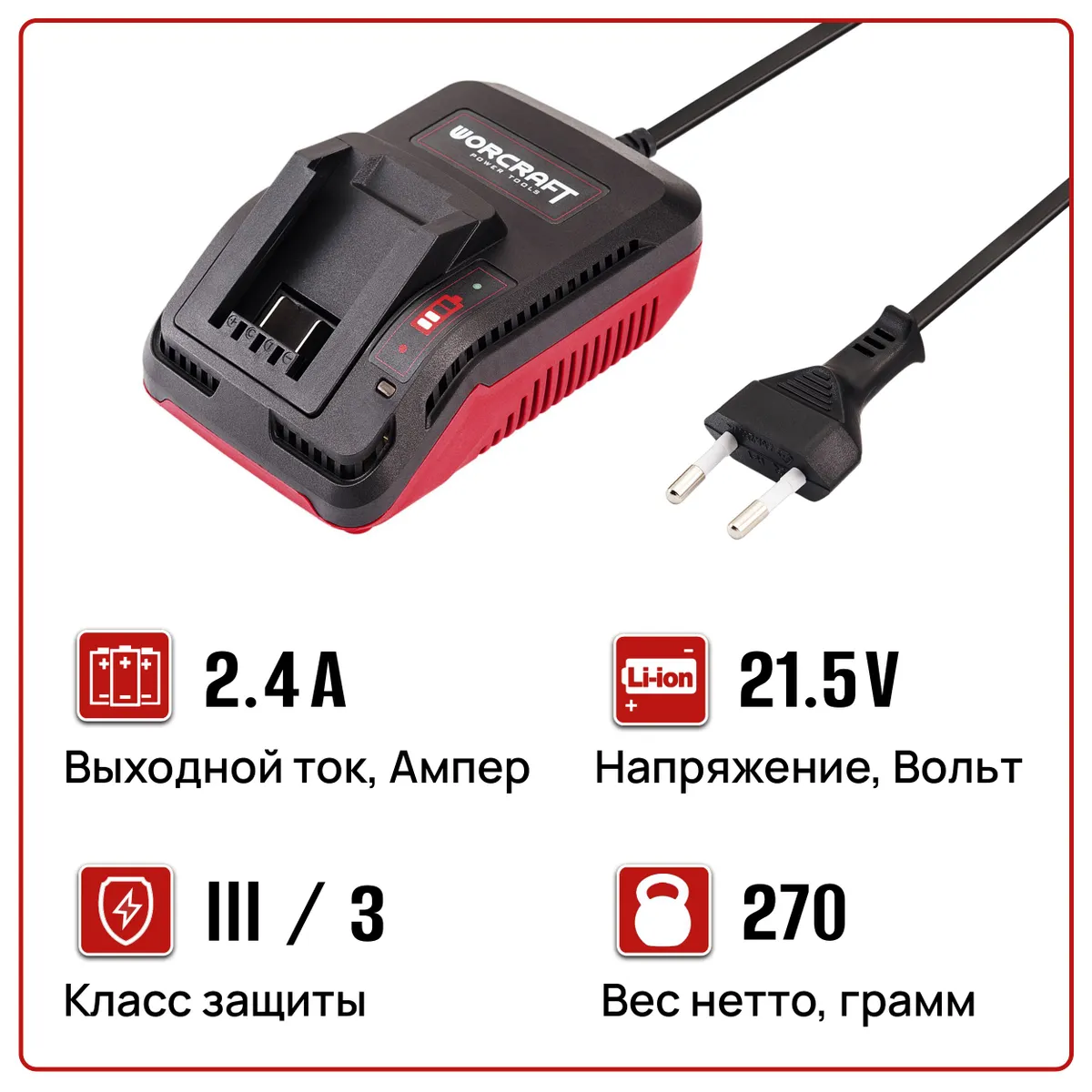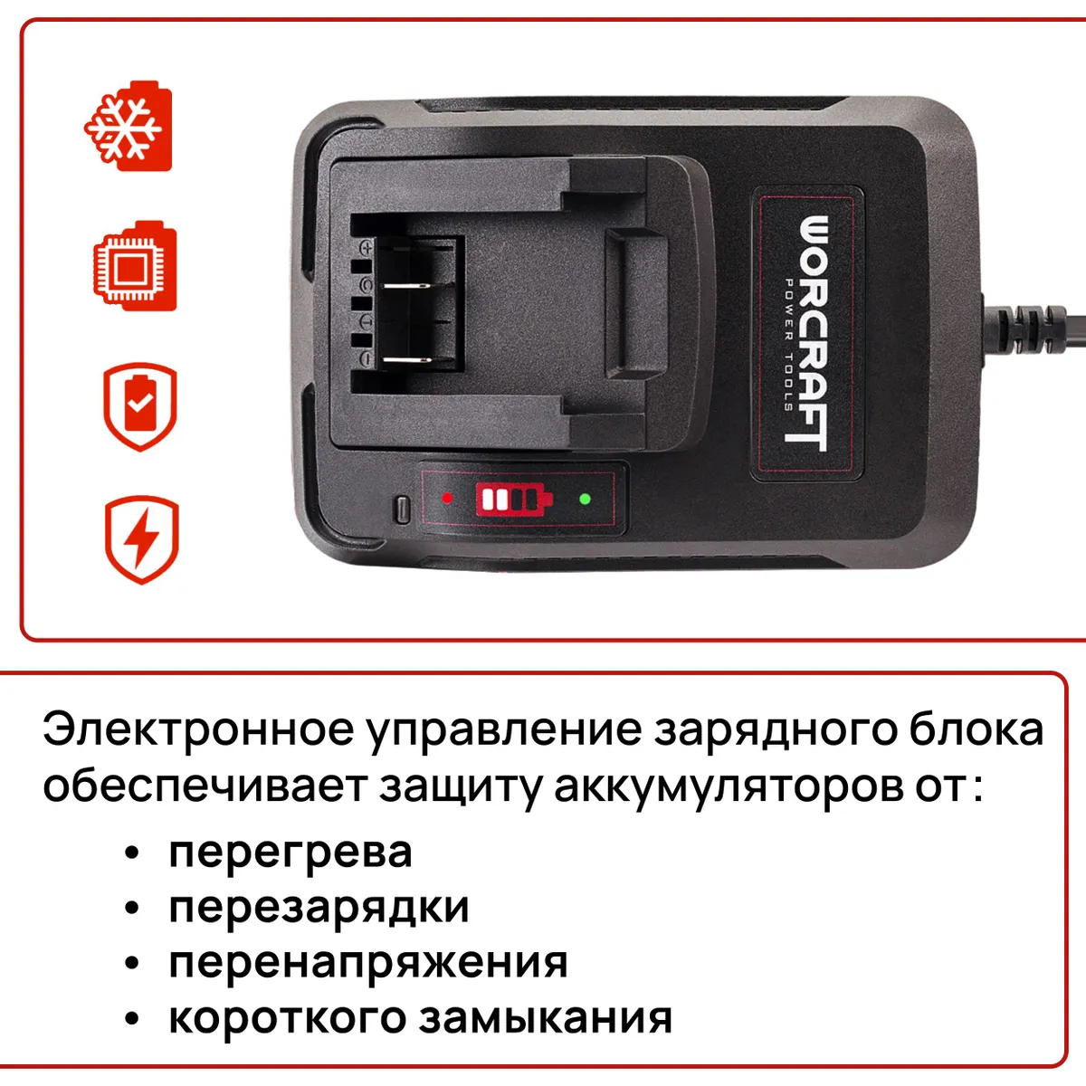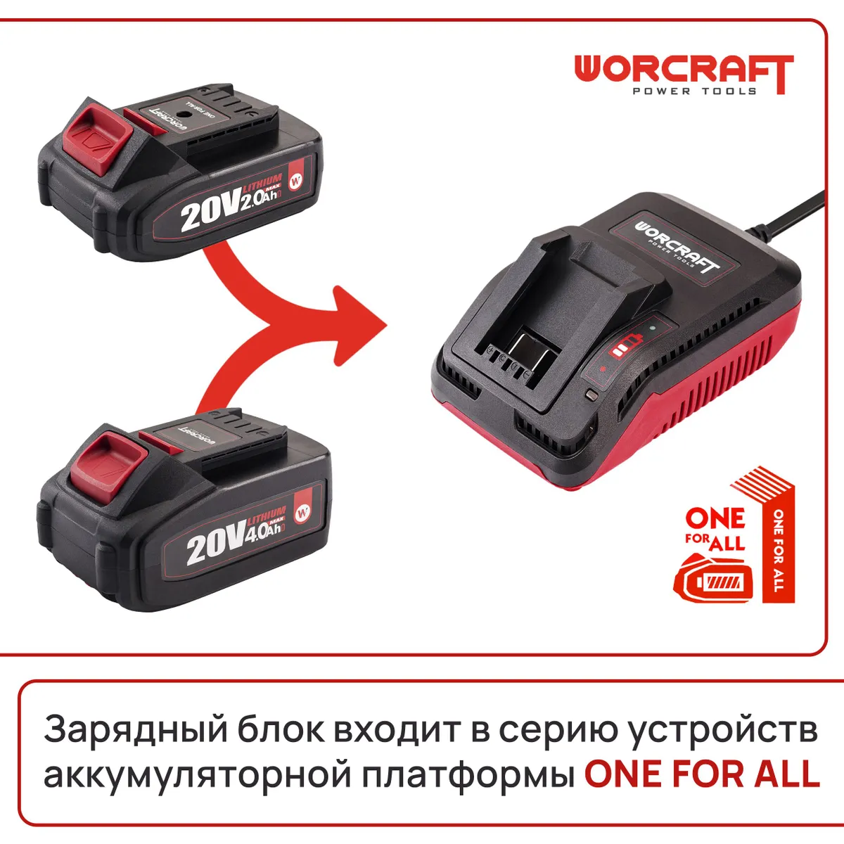 Этот шустрый блок питания WORCRAFT на 20 В подходит для подзарядки любого аккумулятора из линейки ONE FOR ALL.